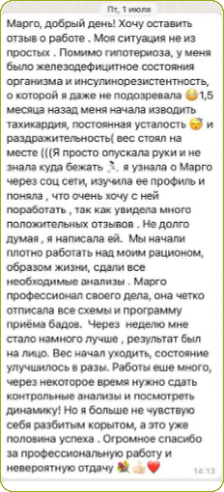 Но перед этим мы убрали все сахара, выпечку и частично глютен, но полностью клиент его убирать не захотела. Приучились пить лимонную воду перед едой. Работали с желчеоттоком. Потом мы расстались на время отпуска (примерно месяц).